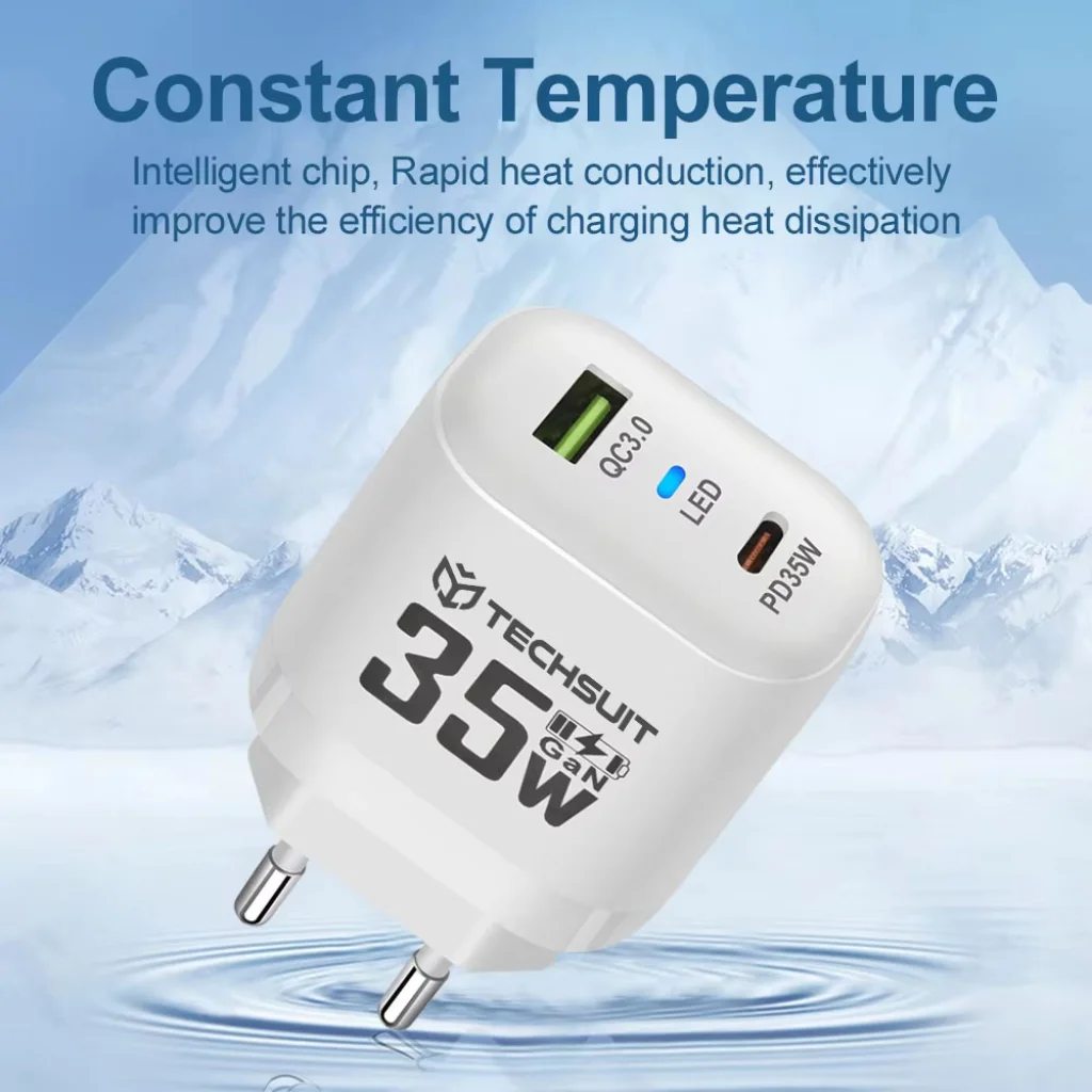 A Techsuit CHPD174 prémium fali töltővel a gyors és hatékony töltés garantált. Ez a modern töltő a legújabb GaN (gallium-nitrid) technológiával készült, amely kisebb méret és hatékonyabb energiaátvitel mellett teszi lehetővé az ultragyors, 35W-os teljesítményt.