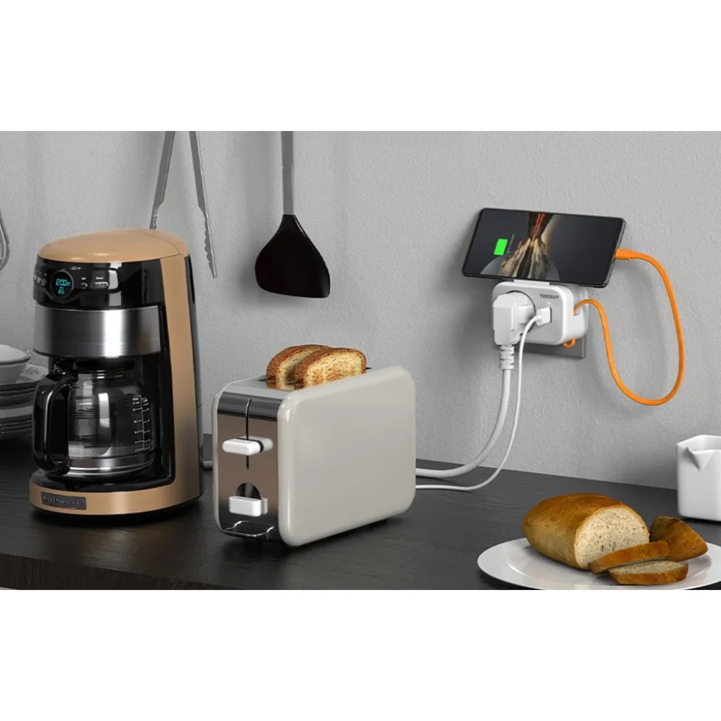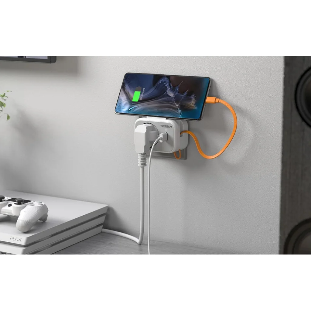 A kompakt Tessan TS-332-DE fali aljzat hasznos lehet otthon és utazás során egyaránt. AC aljzattal, egy USB-A porttal és egy 15 cm-es USB-C kábellel van felszerelve, így akár három eszközt is tölthet vagy működtethet egyszerre. Kiemelkedő teljesítményével és könnyű, hordozható kialakításával tűnik ki, így szinte bárhová könnyedén magával viheti.