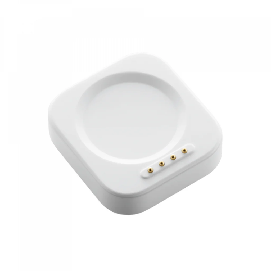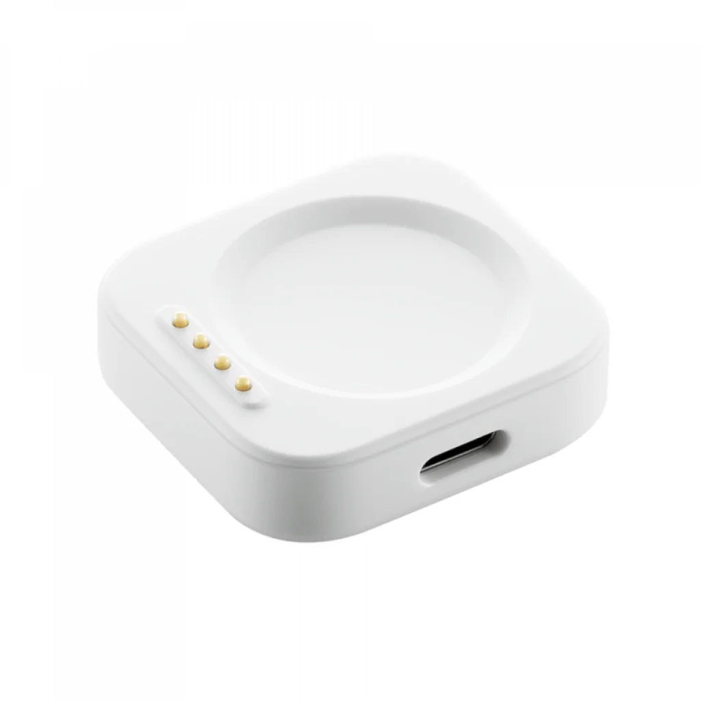 A kompakt és minimalista, négyzetes kialakításnak köszönhetően a töltőtok könnyedén elfér az íróasztalon, éjjeli szekrényen, vagy akár utazótáskájában. Az okosóra stabilan illeszkedik a töltőfelületre, ahol a négy precíziós pogo pin érintkező gondoskodik a megbízható elektromos kapcsolatról. A modern USB-C porton keresztül könnyedén csatlakoztatható bármilyen kompatibilis tápegységhez, biztosítva a kényelmes és gyors töltési élményt.