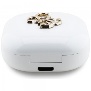 A fülhallgatók letisztult, ergonomikus kialakításúak, amelyek kényelmesen illeszkednek a fülbe. Mindkét fülhallgató szárát elegáns, vertikálisan elhelyezett, arany/ezüst színű "GUESS" felirat díszíti, amely harmonizál a tok fém logójával, tovább erősítve a márkaképviseletet.