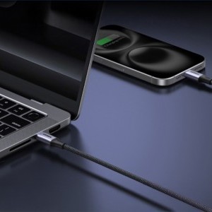 Két eszköz egyidejű töltése. A kábel két USB-C csatlakozóval van ellátva, amelyek lehetővé teszik, hogy egyszerre két eszközt táplálj. Így egyszerre tölthet egy laptopot és egy telefont, egy táblagépet és egy fejhallgatót vagy két okostelefont. Ez ideális azok számára, akik gyakran használnak több eszközt, és szeretnék csökkenteni az asztalukon lévő kábelek számát.
