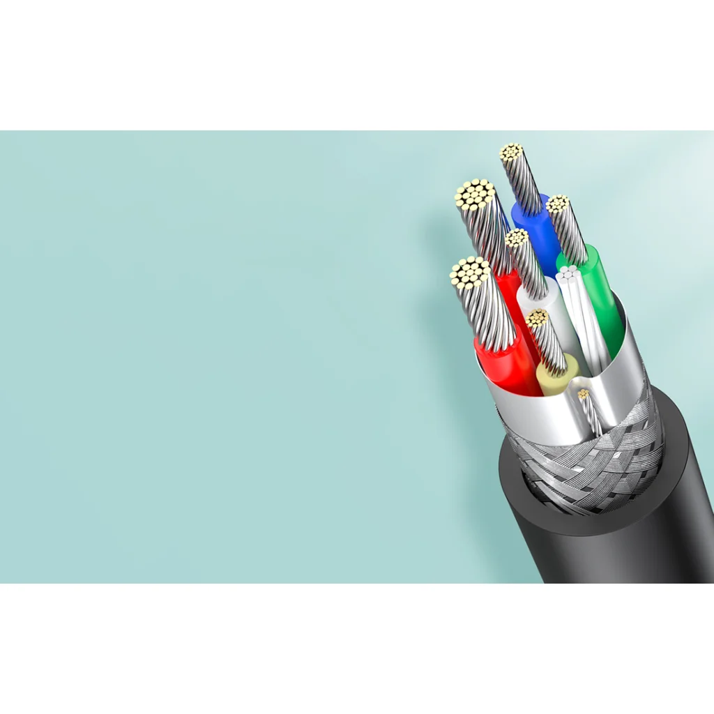 A belső szerkezet horganyzott rézből készült, míg az egészet tartós és rugalmas TPE anyag borítja. Ez teszi a kábelt ellenállóvá a hajlítással, töréssel vagy szakadással szemben. Ezenkívül a kábel csatlakozója, amely a legérzékenyebb a sérülésekre, további védelmet kapott. Ez nemcsak hosszabb élettartamot eredményez, hanem növeli a biztonságot is a használat során.