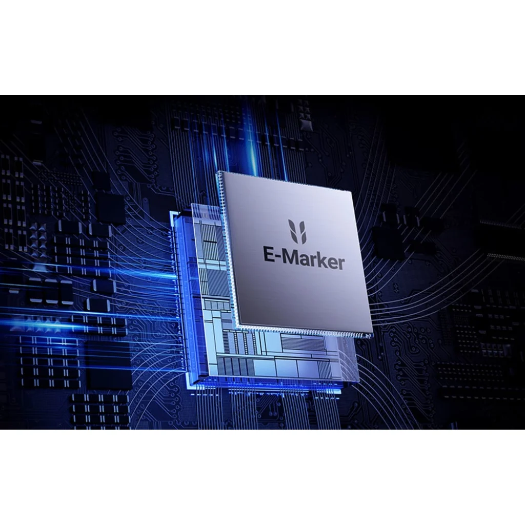 A kábel intelligens E-Marker chippel rendelkezik, amely automatikusan a csatlakoztatott eszközhöz igazítja a töltési teljesítményt, így biztosítva az optimális és biztonságos töltést. A chip fejlett védelmet nyújt a túlfeszültség, a túlmelegedés, a túlterhelés és a rövidzárlat ellen, így mind a kábel, mind a töltendő eszköz biztonságát garantálja.
