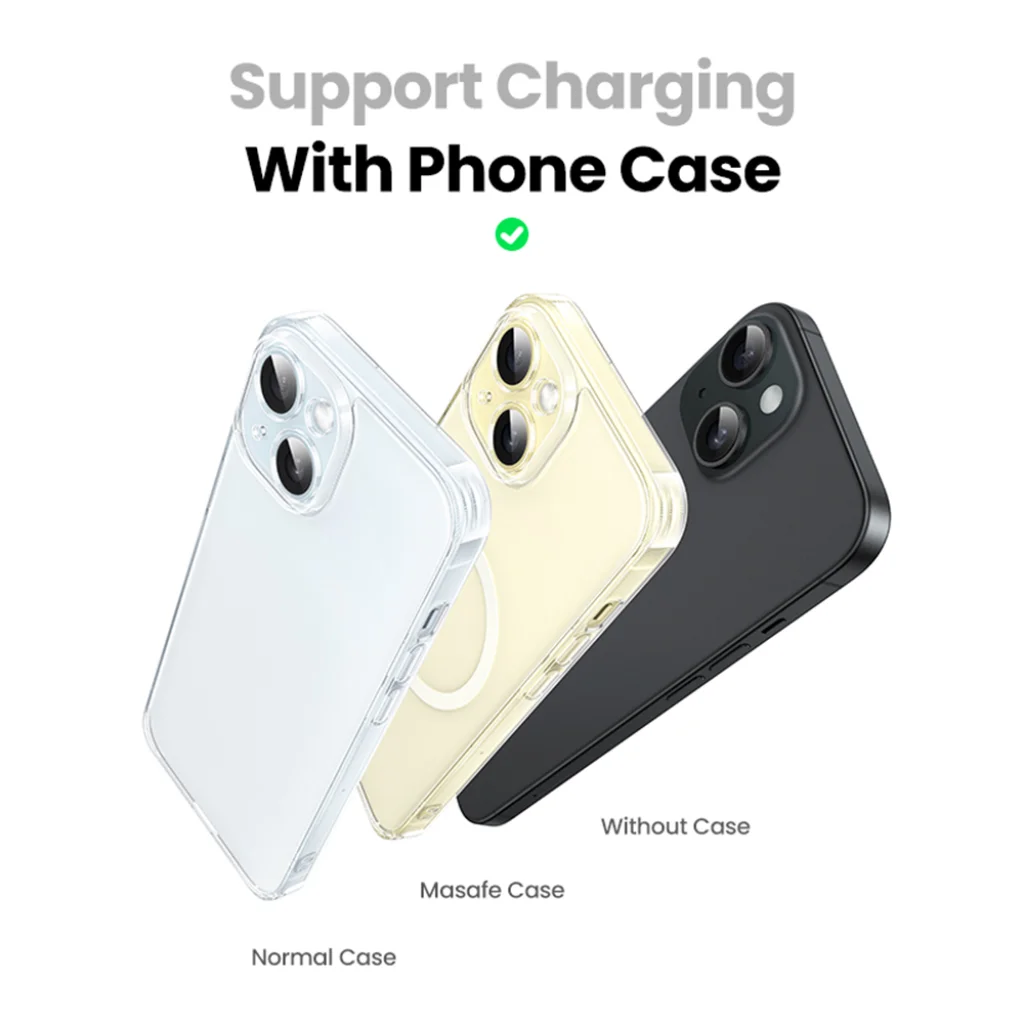 Az Ugreen W706 támogatja a tokkal történő töltést is. Ideális a MagSafe kompatibilis tokokkal, de a vékonyabb normál tokokon keresztül is képes tölteni, így nem kell minden alkalommal levenned a tokot a telefonodról.
