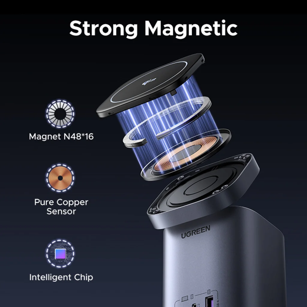 Termék leírás Ugreen - Vezeték nélküli töltő 4 az 1-ben X555 (55321) - MagSafe, Gyors töltés iPhone-hoz, iPadhez, MacBookhoz, GaN, USB, 2xType-C, 65W - Fekete