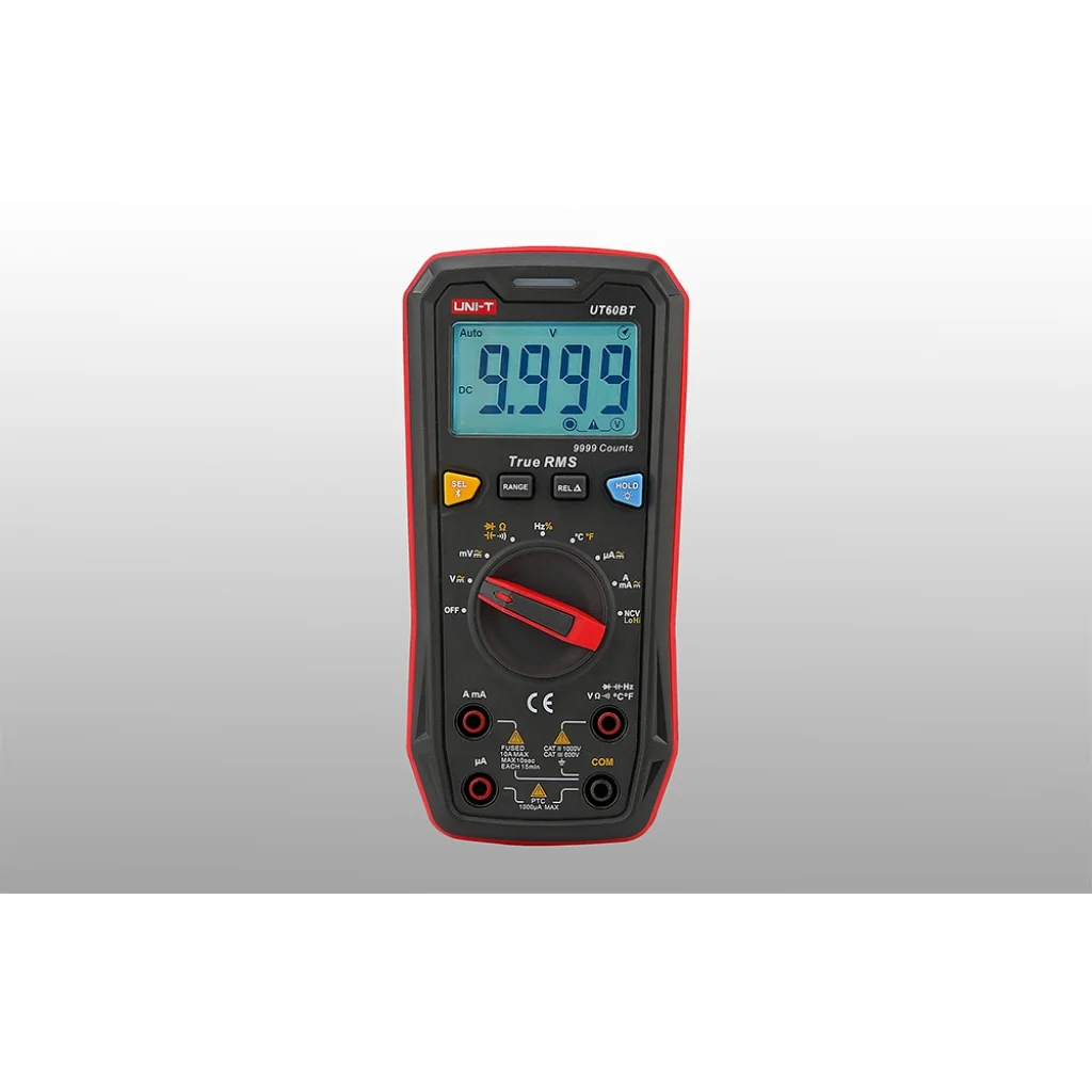 Az UNI-T UT60BT digitális multiméter egy fejlett mérőeszköz, amely egyesíti a funkcionalitást, a pontosságot és a kényelmet. True RMS méréseket, 9999-es számolási felbontást és érintésmentes feszültségérzékelést kínál. Az UT60BT 1000 V-ig képes AC/DC feszültséget, 10 A-ig AC/DC áramot, 100 MΩ-ig ellenállást, valamint a hőmérsékletet, az üzemi ciklust, a diódákat és az áramkör folytonosságát mérni. A készülék Bluetooth, tartás funkcióval, háttérvilágítású kijelzővel, háromszínű LED kijelzővel és relatív üzemmóddal rendelkezik. Támogatja az automatikus és a kézi tartományválasztást is, az alacsony töltöttségi szintet pedig egy megfelelő ikon jelzi. A multiméter megfelel a CE, UKCA és cETLus biztonsági szabványoknak, masszív, dupla fröccsöntött háza pedig tartósságot és kényelmet biztosít.