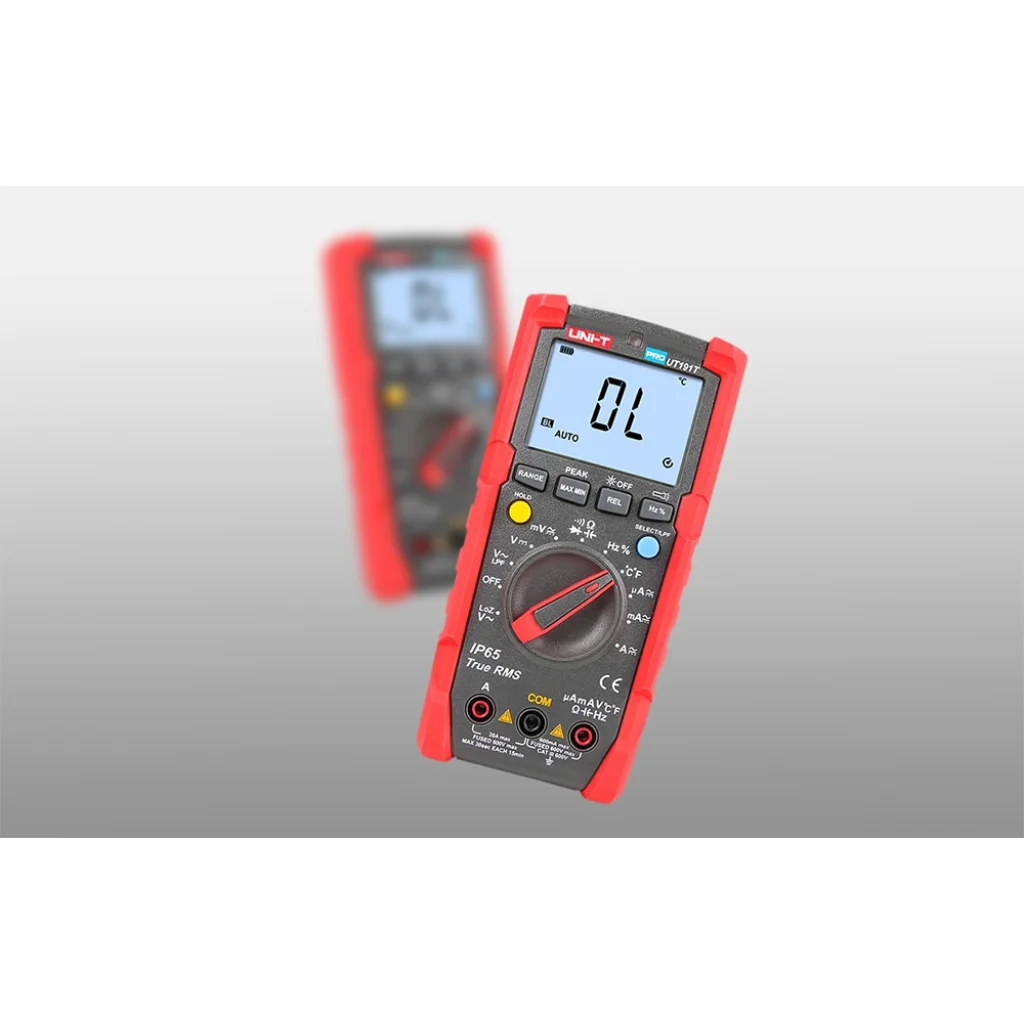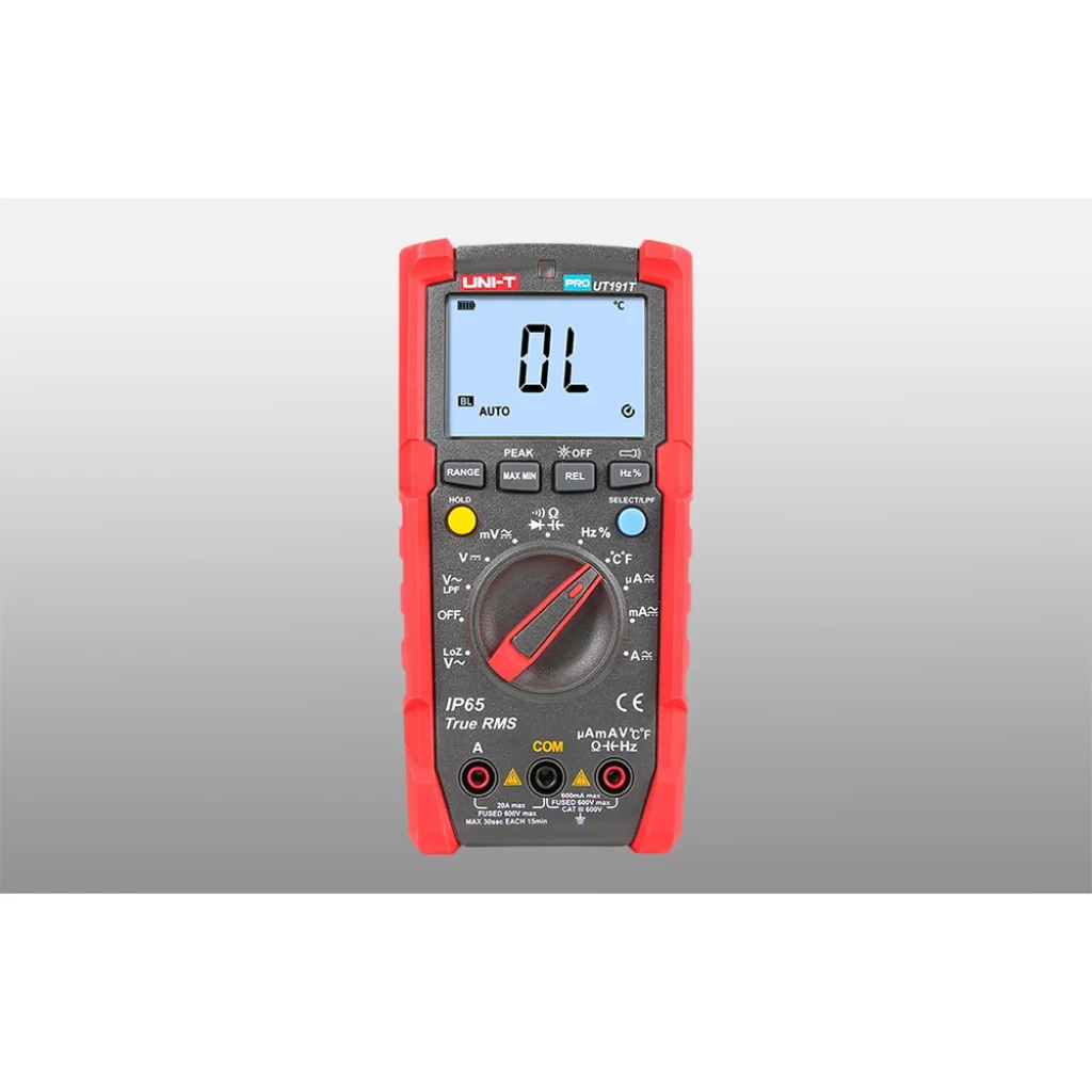 Az UNI-T UT191T egy professzionális digitális multiméter, amelyet zord ipari környezetben való használatra terveztek. A True RMS funkcióval felszerelt mérőműszer pontos feszültség-, áram-, ellenállás-, kapacitás-, frekvencia- és hőmérséklet-méréseket biztosít. Az UT191T 6000-es felbontást és automatikus vagy kézi tartományválasztást kínál. A mérő háza megfelel az IP65 szabványnak, és akár 2 méteres magasságból történő leejtést is kibír, így ideális eszköz a zord és változó körülmények között történő használatra.