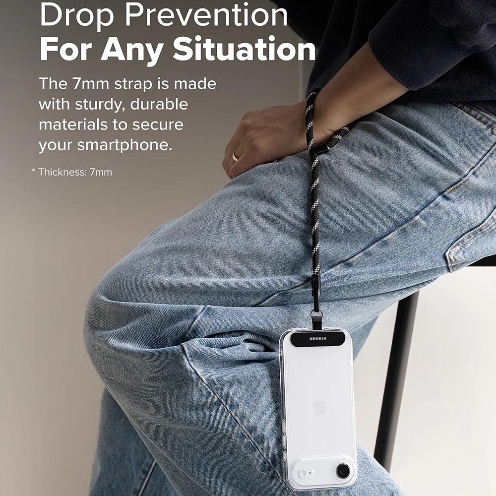 • Megbízható cseppállóság: A robusztus, 7 mm vastag pánt strapabíró anyagokból készült, amelyek megbízhatóan megvédik telefonját a véletlen leejtésektől.