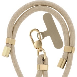 Univerzális Csuklóheveder, amely kényelmes módja a telefon, kulcs vagy más kisméretű kiegészítők hordozásának, amelyeket mindig jól jön a közelben tartani. A 6 mm vastag fonott zsinór arany elemekkel kombinálva modern és rendezett megjelenést kölcsönöz, az arany fém karabiner pedig lehetővé teszi, hogy könnyedén rögzítse a hevedert egy tokhoz, hátizsákhoz vagy kulcstartóhoz.