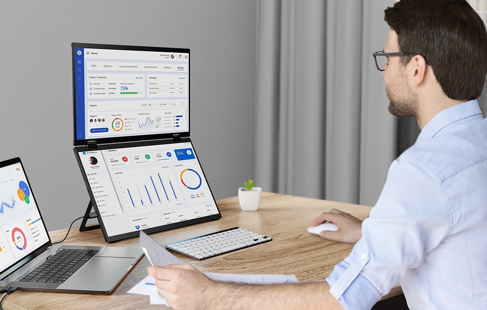 Az Uperfect Delta kettős képernyővel rendelkezik, amelyek pozíciója állítható, csökkentve a szem- és nyakfáradtságot. Az összecsukható kialakítás lehetővé teszi a képernyők különböző szögekbe állítását, ami ideális prezentációkhoz, online megbeszélésekhez vagy több feladat egyidejű végzéséhez. A két képernyő együtt vagy egymástól függetlenül működhet, így rugalmasabban és hatékonyabban használhatja a munkahelyét. Ez lehetővé teszi, hogy teljesen a munkájára koncentráljon, minimalizálva az ablakok közötti görgetés és váltás során eltöltött időt.