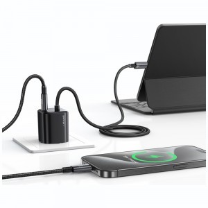 A USAMS JC Series CC264 fali töltő egy modern eszköz, amely kivételes töltési teljesítményt nyújt. 30 W-os teljesítménnyel, USB-C porttal, és egy beépített USB-C kábellel gyorsan és hatékonyan töltheted eszközeidet. A Power Delivery (PD) technológiával lehetővé teszi a gyors töltést olyan eszközök számára, mint az okostelefonok és táblagépek. A tartósság érdekében kiváló minőségű anyagokból készült, ellenáll a sérüléseknek. Kompakt mérete miatt minden utazótáskába belefér. Az USAMS logó a töltőn kiemeli az eszköz egyediségét. A GaN technológia hatékony és gyors töltést biztosít. Két eszközt tölthetsz egyszerre a beépített USB-C kábellel és USB-C porttal, így nincs szükség szabad konnektort keresni.