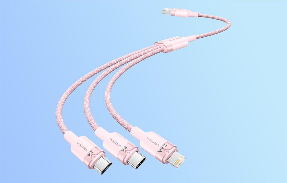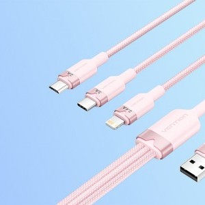 Az USB 2.0 A - 3 az 1-ben 3A Vention CTPPG 1,5M kábel (rózsaszín) egy sokoldalú megoldás, amely lehetővé teszi, hogy különböző eszközöket töltsön és szinkronizáljon egyetlen kábellel. Három különböző csatlakozóval - Lightning, USB-C és Micro-B - felszerelve tökéletes lesz a modern okostelefonok, valamint a régebbi eszközök, például powerbankek és fényképezőgépek töltésére.