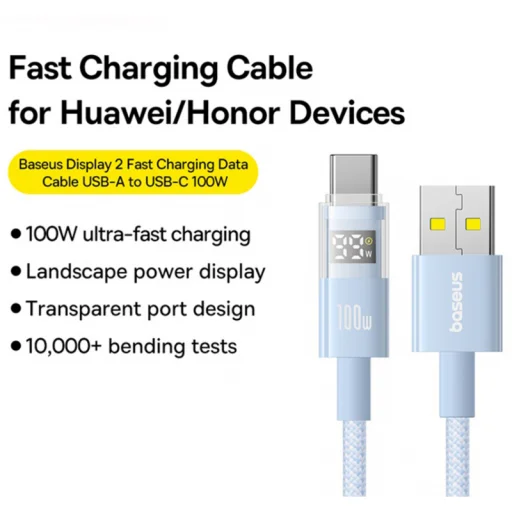 Sietsz, és szükséged van a telefonod, tableted vagy laptopod gyors feltöltésére? A Baseus Display 2 USB-A - USB-C kábellel ultra-gyors töltést érhetsz el akár 100W-ig, ami elég erőteljes ahhoz, hogy akár a kompatibilis laptopokat is feltöltse. Ideális bármely Type-C porttal rendelkező eszköz számára, ez a kábel biztosítja a hatékony és biztonságos töltést energia-veszteség nélkül. Fonott nejlonból és cinkötvözetből készült, nemcsak prémium megjelenést kölcsönöz, de tartósságra is tervezett. Akár otthon, akár az irodában vagy az autóban használod napi szinten, a kiváló minőségű anyagok rendkívüli ellenállást nyújtanak a kopás, hajlítás és húzás ellen. Felejtsd el a kábeleket, amelyek néhány hét után eltörnek. A 2 méteres hosszúságú kábel elegendő mozgásszabadságot kínál, miközben kompakt és könnyen hordozható marad. Az integrált digitális kijelző valós időben mutatja a töltési teljesítményt, így irányítást és átláthatóságot biztosít a teljesítmény felett.