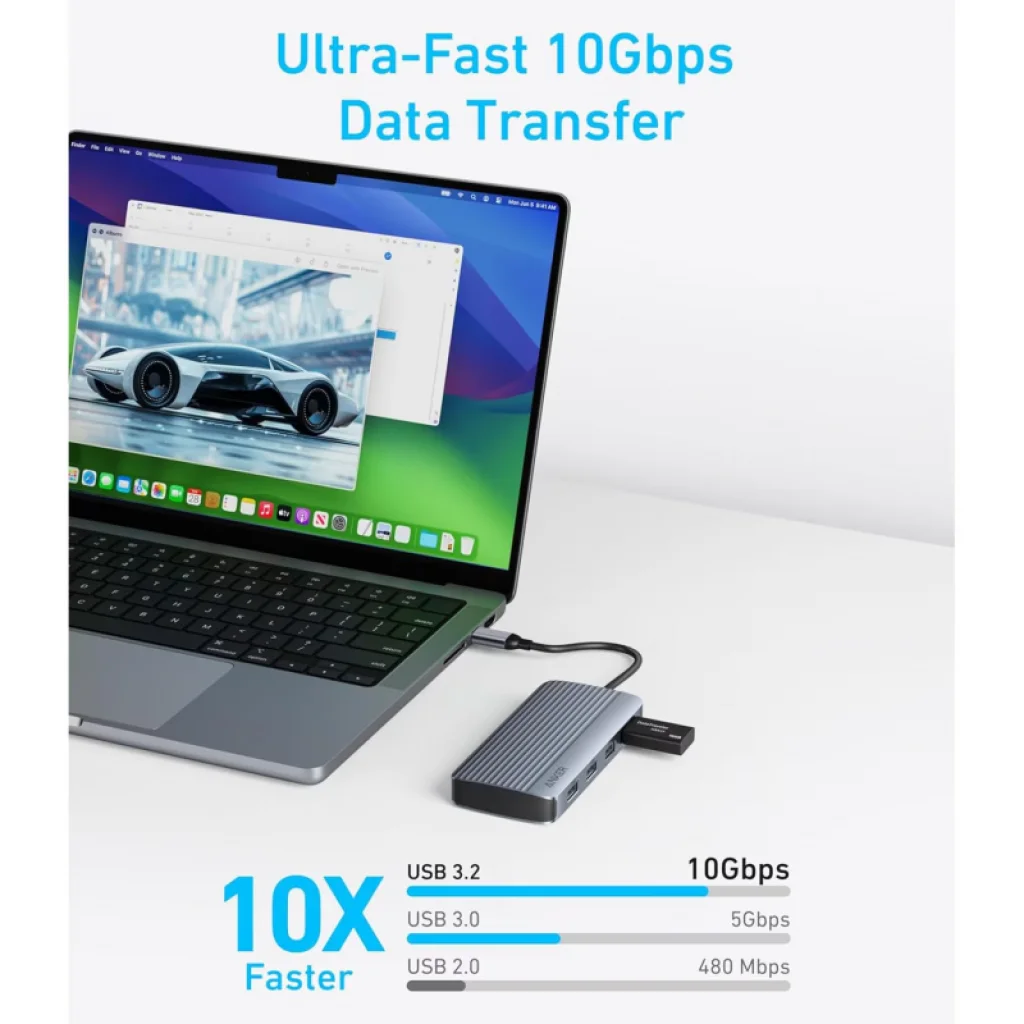 Az USB-C Hub Anker - Szürke egy 7 az 1-ben USB-C elosztó, amely ideális azoknak, akik gyorsaságra, kiterjesztett csatlakoztathatóságra és maximális produktivitásra van szükségük az irodában, otthon vagy útközben. Kifejezetten multitaskingra tervezve ez a hub egyetlen USB-C portot teljes munkaállomássá alakít át, kettős video kimenetekkel, gyors töltéssel, ultragyors adatátvitellel és széles körű kompatibilitással a modern eszközökkel. Az 2 HDMI port segítségével egyszerre két külső monitort csatlakoztathatsz 1080p/60Hz felbontással, így kibővítheted a munkaterületedet sima szerkesztés, elemzés, streamelés vagy multitasking céljából. A professzionális szintű adatátvitelt az USB 3.2 port 10 Gbps sebességgel biztosítja, amely ideális nagy fájlok, külső SSD-k vagy gyors biztonsági mentések számára. Az USB-C Power Delivery port akár 100W teljesítményt is biztosít, így a laptopod folyamatosan töltve maradhat a hub használata közben (85W áll rendelkezésre, miután az eszköz által használt energia levonásra kerül). A prémium alumínium fém kivitel eleganciát és tartósságot kölcsönöz a hubnak, az integrált védelemi funkciók (rövidzárlat, túlfeszültség, hőmérséklet-szabályozás) pedig garantálják a biztonságos használatot.