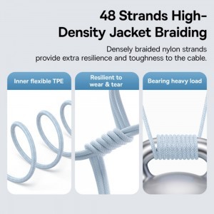 A Baseus Gem adatkábel 48 szálból álló, nagy sűrűségű fonott nylon borítást kapott, amely extra ellenállást és szívósságot biztosít. Belső rugalmas TPE anyaga és kopásálló kialakítása révén rendkívül strapabíró, ellenáll a mindennapi használat során fellépő húzódásoknak, csavarodásoknak és nagy terhelésnek, hosszú élettartamot garantálva. Felejtsd el a törött kábeleket!