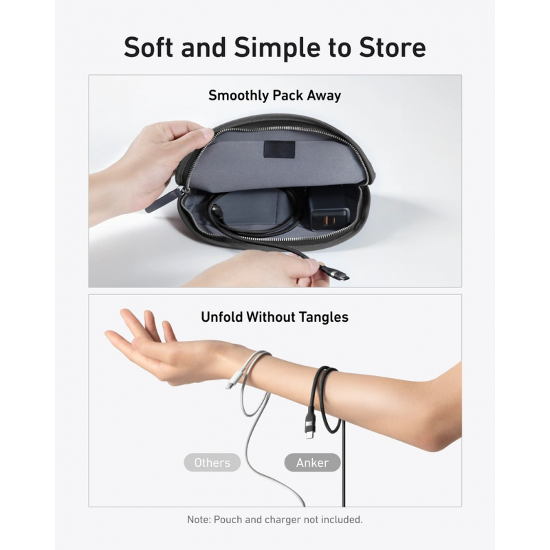 A felhasználói élményt szem előtt tartva az Anker kábel egy integrált szilikon kábelrendezővel érkezik. Ez a praktikus kiegészítő megkönnyíti a kábel feltekerését és tárolását, miközben hatékonyan megakadályozza a gubancolódást. Akár otthon, akár útközben, a kábel mindig rendezett marad, és "soft and simple to store" elve alapján könnyedén elpakolható. A gyártó a környezettudatosságra is nagy hangsúlyt fektetett: a kábel környezetbarát, műanyagmentes csomagolásban kerül forgalomba, minimalizálva az ökológiai lábnyomot.