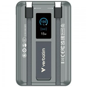 A Verbatim Charge 'n' Go egy praktikus energiaforrás, amely 10000 mAh kapacitással rendelkezik, és mindennapi okostelefonok és mobil eszközök töltésére tervezték. A modell egy TFT kijelzőt használ, amely mutatja az energia szintet és az aktuális működési státuszt. A készülék kombinálja a vezetékes és vezeték nélküli töltést, növelve a felhasználói kényelmet és rugalmasságot. Kompakt mérete miatt könnyen elfér egy táskában vagy hátizsákban, és a több eszköz egyidejű töltése növeli a funkcionalitását. A Charge 'n' Go alkalmas mind utazásra, mind munkára vagy napi tevékenységekre. A biztonsági mechanizmusok közé tartozik a rövidzárlat, a túltöltés, a túláram, a túlmelegedés és az alacsony feszültség elleni védelem. A FOD funkció felelős az idegen tárgyak észleléséért a vezeték nélküli töltési területen, növelve a felhasználói biztonságot. Az eszköz beépített tartóval rendelkezik, amely lehetővé teszi a telefon kényelmes függőleges vagy vízszintes elhelyezését töltés közben. A kijelző mutatja az akkumulátor szintet és az aktuális töltési státuszt, megkönnyítve a működés ellenőrzését. A konstrukció úgy van tervezve, hogy stabil teljesítményt biztosítson 0 és 35 Celsius fok közötti hőmérsékleten. A csomag tartalma: powerbank, mágneses gyűrű, USB-C kábel, kézikönyv.