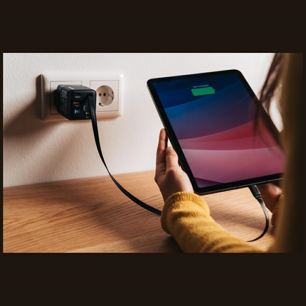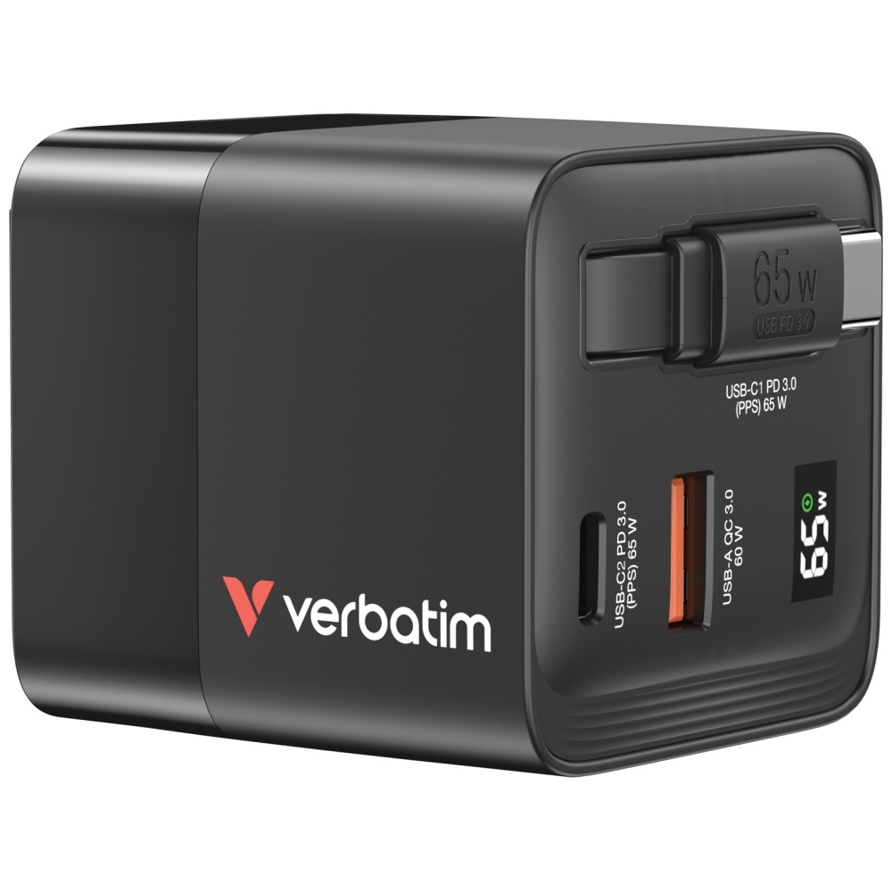A Verbatim Power Adapter GaN 65W rendkívüli teljesítményt és sokoldalúságot kínál, támogatva a különböző teljesítményszabványokat. Lehetővé teszi akár 3 eszköz egyidejű töltését. A töltő USB-C, USB-A portokkal és egy visszahúzható USB-C kábellel rendelkezik, ami lehetővé teszi mobil eszközök, laptopok és más kiegészítők töltését. Az US csatlakozó és a két adapter (EU/UK) biztosítja, hogy a töltő világszerte használható legyen. A készüléknek köszönhetően utazásaihoz csak egyetlen adapterre van szüksége. A töltő kiváló minőségű tűzálló polikarbonátból készült, amely tartósságot biztosít a sérülésekkel szemben. A PPS technológia biztosítja az optimális töltéshez szükséges megfelelő mennyiségű energiát. A kijelző valós időben tájékoztat a töltési teljesítményről és a gyors töltés állapotáról. A GaN technológia hatékony töltést biztosít és csökkenti a hőtermelést. A töltő méretei 58.5 x 50 x 50 mm, súlya 157 g, anyaga tűzálló PC, maximális teljesítménye 65 W. Az USB-C kábel, az USB-C és az USB-A kimeneti feszültségei különböző kombinációkban elérhetők, a PPS technológia pedig 5-11V / 4.5 A teljesítményt biztosít.