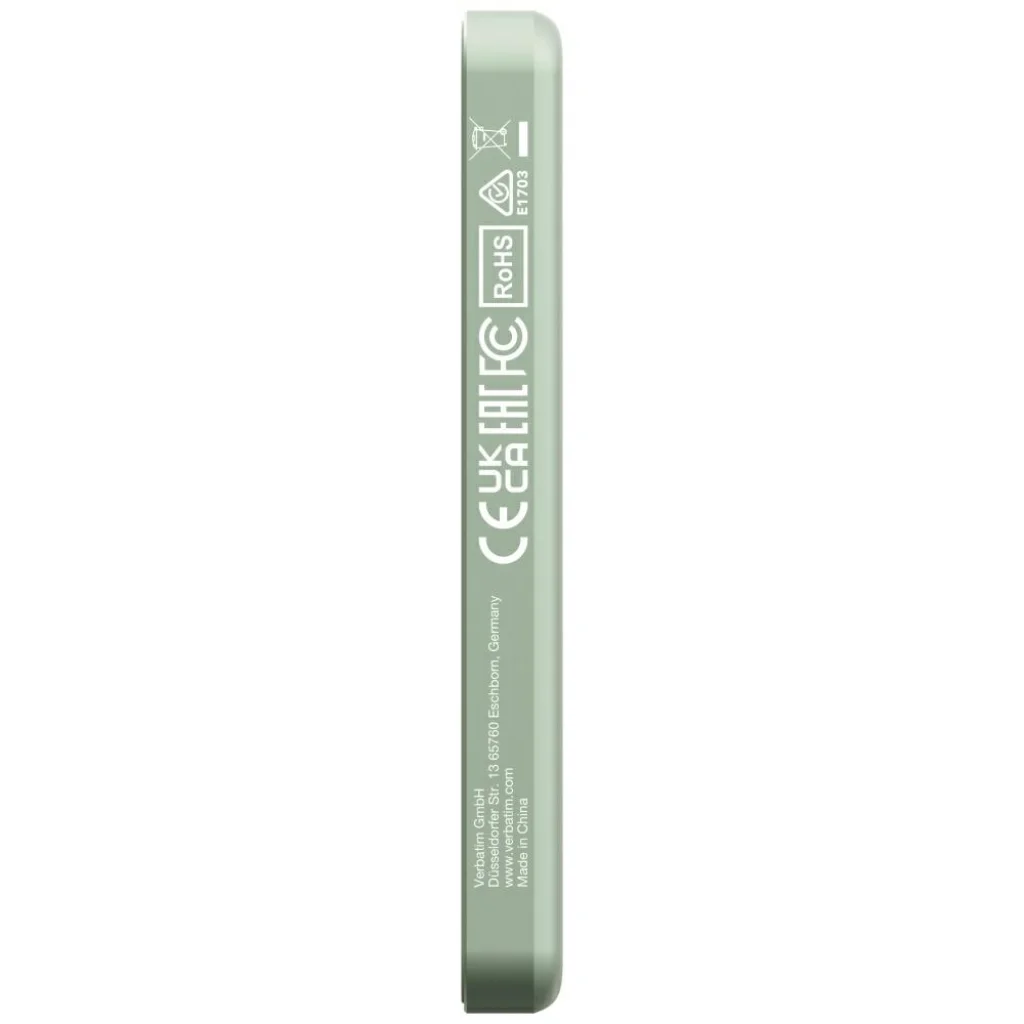 Modern megjelenése elegáns zöld színben különleges karaktert kölcsönöz a powerbanknak, és megkülönbözteti a klasszikus fekete modellektől. A masszív ház kiváló minőségű anyagokból készül, ami tartósságot és esztétikai megjelenést biztosít még intenzív használat mellett is. A Verbatim n Go Essentials tökéletesen illeszkedik mind a modern okostelefonokhoz, mind pedig más induktív töltést támogató eszközökhöz.