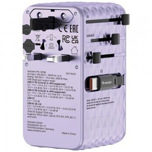 A Verbatim Travel Adapter egy kompakt és funkcionális univerzális adapter, amely több mint 180 országban támogatja az eszközök töltését. Ideális laptopok, okostelefonok, Bluetooth hangszórók, táblagépek, power bankok és sok más eszköz töltésére. Tartalmaz két beépített visszahúzható USB-C kábelt, valamint egy AC aljzatot, USA/JP aljzatot, USB-C portot, USB-A portot és két további visszahúzható USB-C kábelt, összesen akár 70 W kimeneti teljesítménnyel. A GaN technológia biztosítja az energiahatékony töltést és a hőtermelés csökkentését. Az adapter elegáns, fekete 3D gyémánt mintázatú házzal rendelkezik, és magas minőségű égésgátló polikarbonátból készült. Tanúsított CE, UKCA, FCC és ROHS szabványok szerint, valamint 10A biztosítékkal van ellátva a BS1362 szabvány szerint, és praktikus utazótokkal kapható. Maximális teljesítménye 70 W, különféle csatlakozókhoz és aljzatokhoz is alkalmas. A termék támogatja többek között a PD 3.0, QC 4+ és QC 3.0 szabványokat. A színe lila.