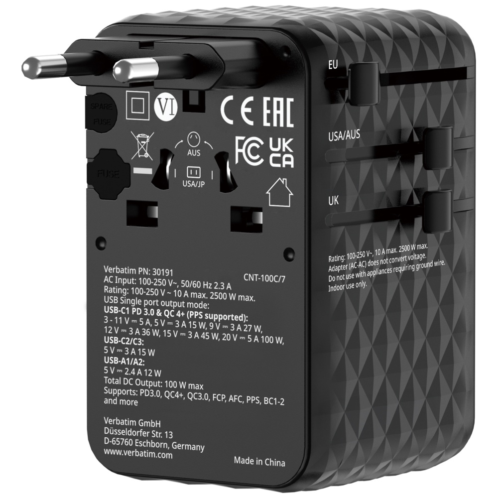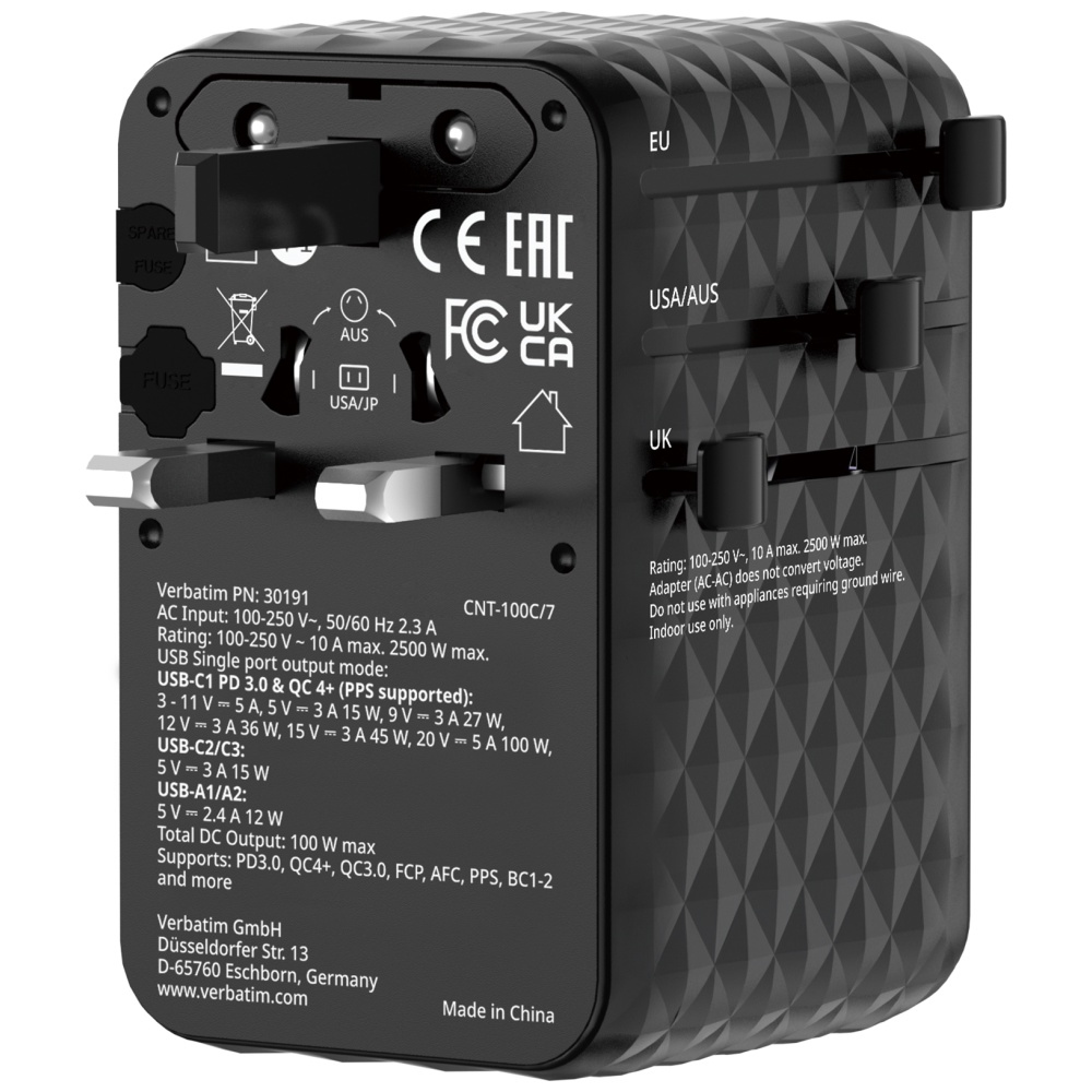 - Típus: Verbatim Utazóadapter EU/UK/US GaN 2xUSB-C/2xUSB-A/1xUSB-C PD 100W