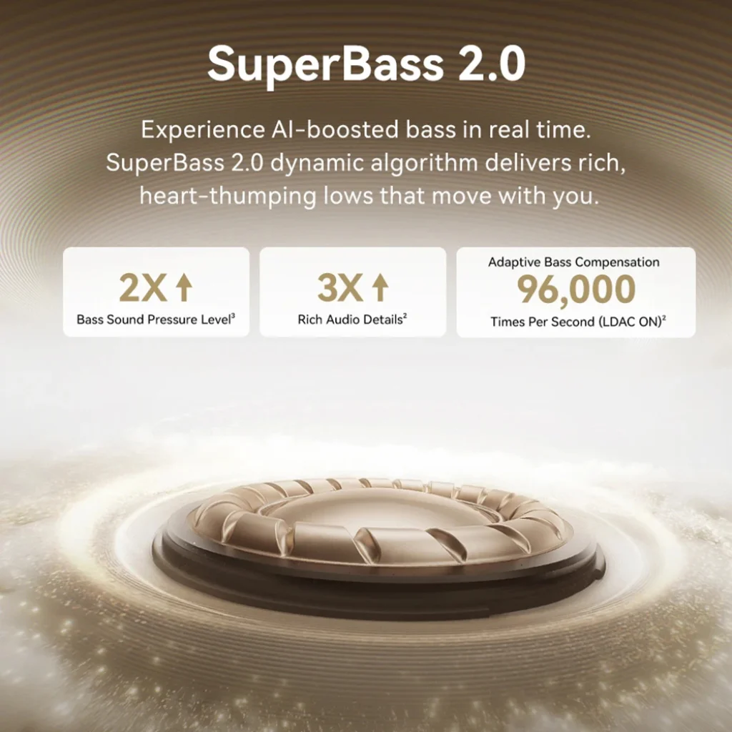 - SuperBass 2.0 mesterséges intelligenciával: A szabadalmaztatott SuperBass 2.0 dinamikus algoritmus valós időben, mesterséges intelligencia segítségével optimalizálja a mélyhangokat. Élvezze a gazdag, szívbemarkoló basszusokat, amelyek 2-szer nagyobb hangnyomást és 3-szor több hangrészletet kínálnak, az LDAC bekapcsolásával másodpercenként akár 96 000 alkalommal történő adaptív basszuskompenzációval.