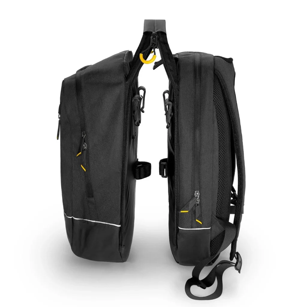 - Háton is viselheted. A dupla biciklis táska egy mozdulattal kényelmes hátizsákká alakul.