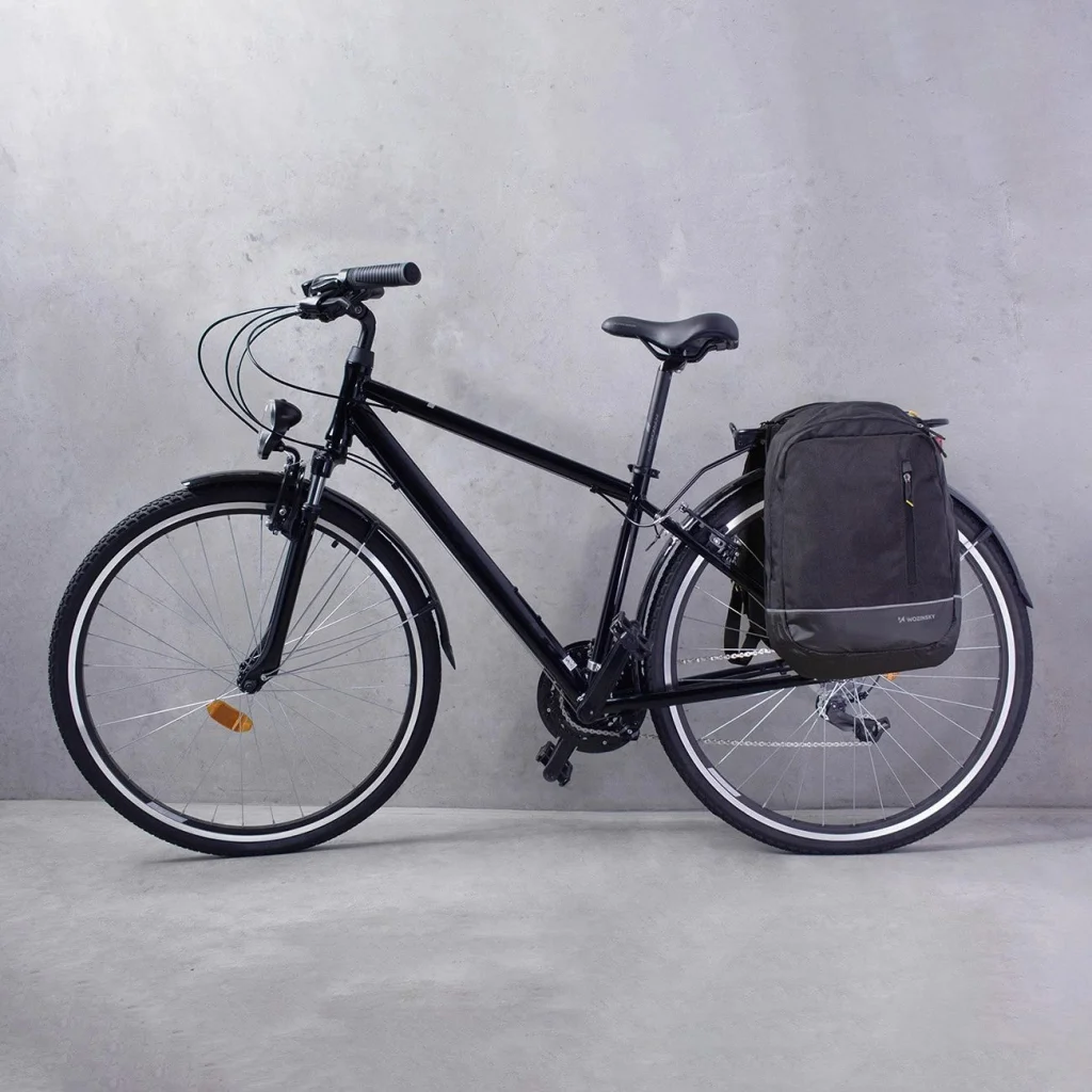 A Wozinsky WBB30BK dupla biciklis táska könnyen kényelmes kétvállas hátizsákká alakítható. Csak ki kell cipzárazni a fő cipzárt - belül különleges rögzítők találhatók, amelyek lehetővé teszik a táska csomagtartóra rögzítését. Akaszd a füleket a csomagtartóra és rögzítsd az alsó tépőzárat a vázon. Kész!