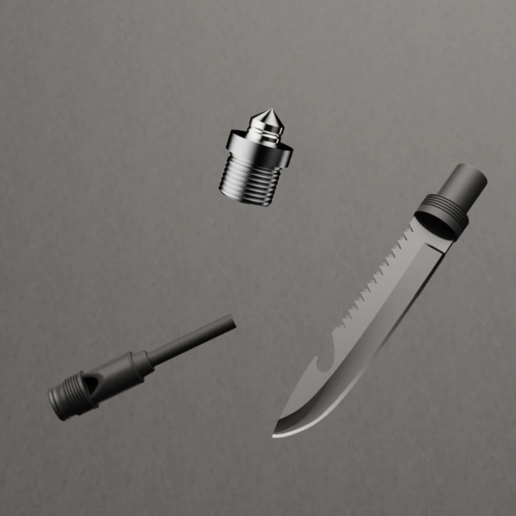 - Vészhelyzeti támogatás: Az üvegtörő, síp és tűzgyújtó növeli a felkészültséget vészhelyzetek esetén.