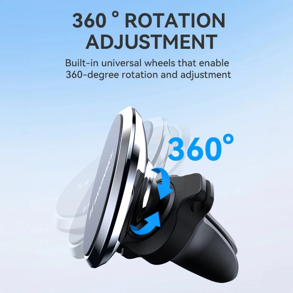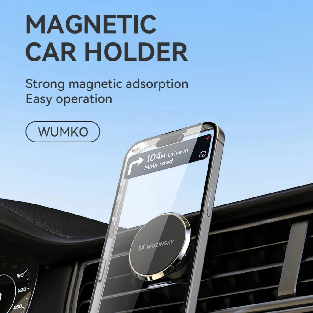 Wozinsky WUMKO mágneses autós telefontartó légszellőzőre, kábelklipszekkel - fekete A Wozinsky WUMKO mágneses autós tartó kivételes stabilitást és biztonságot biztosít a telefonodnak vezetés közben. A beépített mágneseknek köszönhetően a készülék szilárdan tart, még egyenetlen úton is. A 360°-os elforgatható kialakítás lehetővé teszi a nézési szög egyszerű beállítását, növelve a használat kényelmét. A fogantyút egy kézzel is könnyen lehet használni, ami lehetővé teszi a vezetésre való koncentrálást, és tartóssága sok évi használatot garantál. Műszaki adatok:
