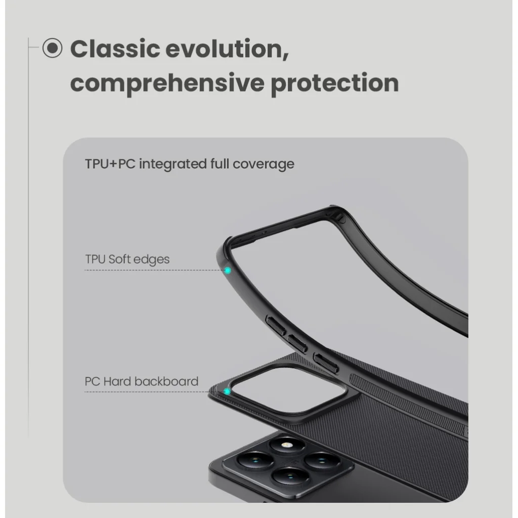 Kemény és tartós műanyagból áll a hátoldalon, valamint TPU puha műanyagból az oldalakon.