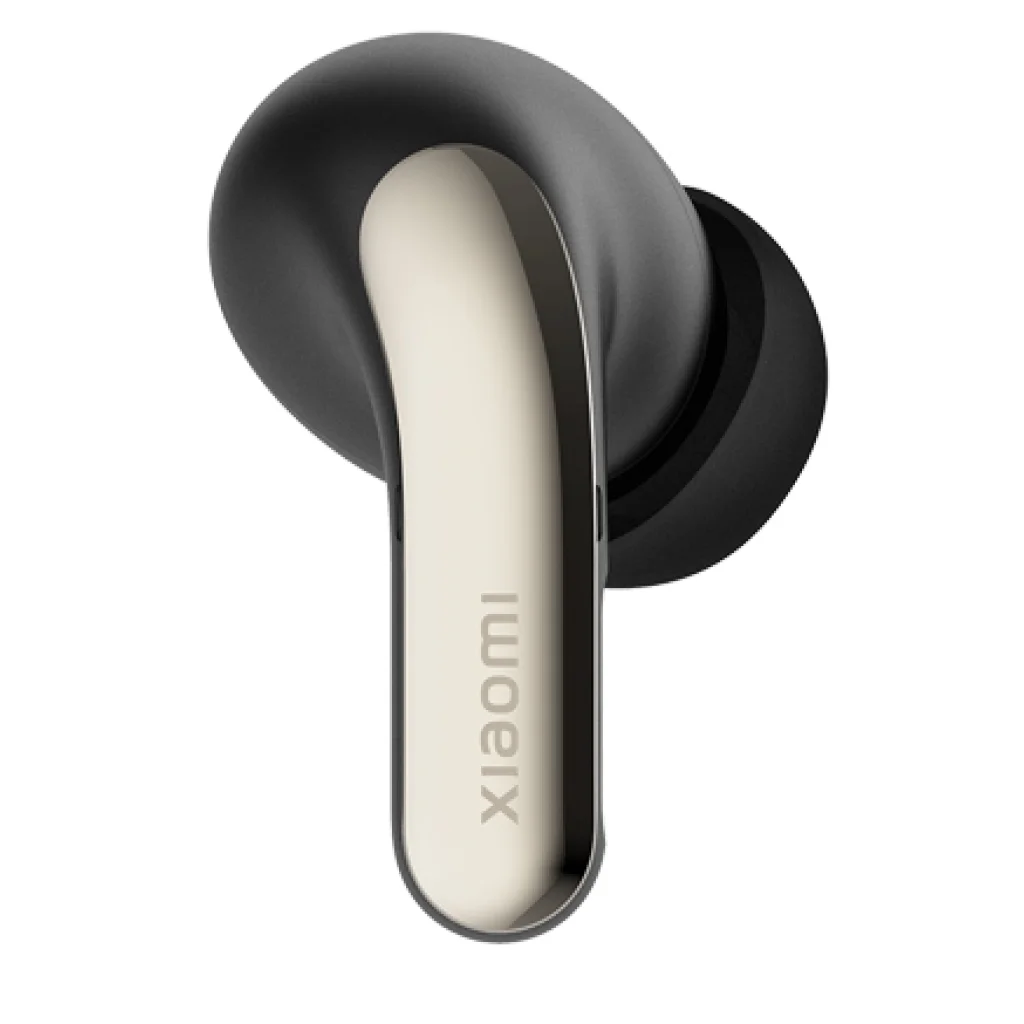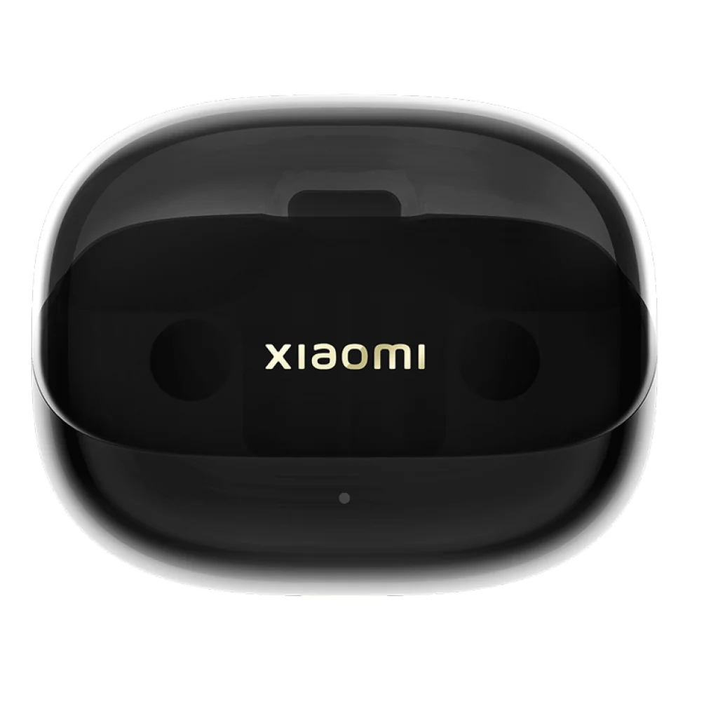 Az ergonomikus kialakítású fülhallgatók tökéletesen illeszkednek a fülbe, hosszan tartó viselés esetén is maximális kényelmet biztosítva. A "Xiaomi" logóval díszített száron egy elegáns arany/fémes betét található, ami kiemeli a fülhallgatók prémium jellegét. Az "R" (jobb) jelölés segít a gyors beazonosításban. A hozzá tartozó fényes fekete töltőtok nemcsak védi és tölti a fülhallgatókat, de elegáns kiegészítője is eszközeinek, minimalista LED jelzőfénnyel az előlapon.