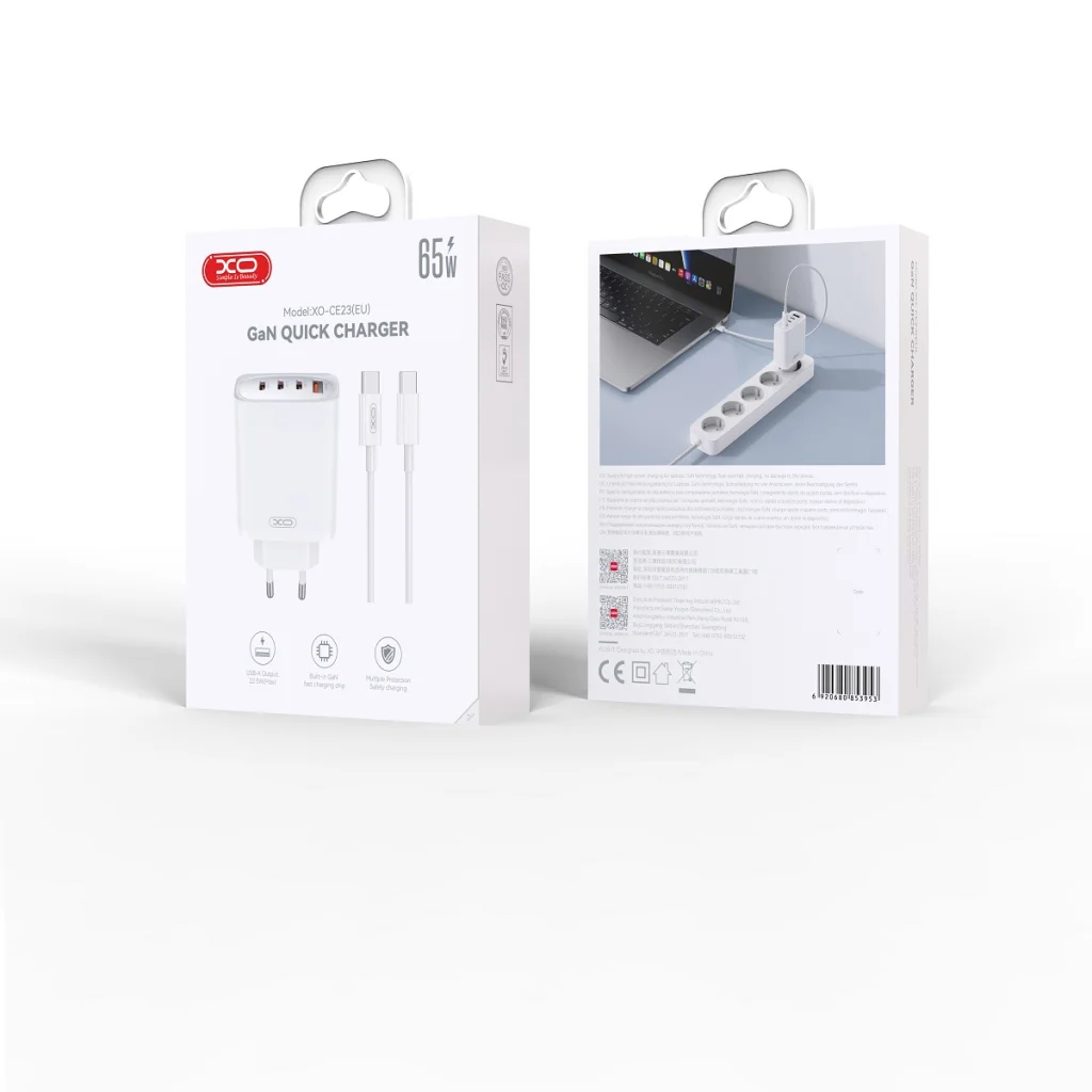 Az XO CE23 egy fejlett hálózati töltő, amely négy csatlakozóval rendelkezik: három USB-C PD aljzattal és egy USB aljzattal, összesen 65 W teljesítménnyel. Elég energiát biztosít ahhoz, hogy gyorsan tölthesse még a legnagyobb elérhető mobil eszközöket is. A modern minimalista megjelenés minden belső térhez illeszkedik, és a kivitelezés minősége azt jelzi, hogy egy masszív és tartós eszköz.