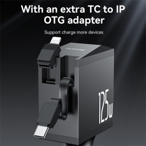 - Jellemzők: 4 az 1-ben, gyors töltés, laptop töltés támogatás (egy porton), visszahúzható kábel, Lightning adapterrel.
