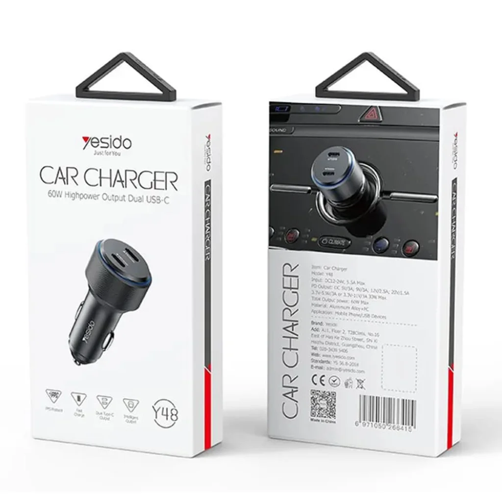 Yesido - Autós töltő (Y48) - 2x Type-C, Gyors töltés, 60W - Fekete