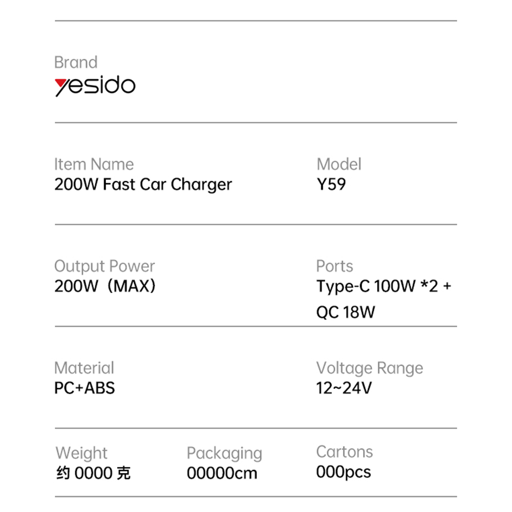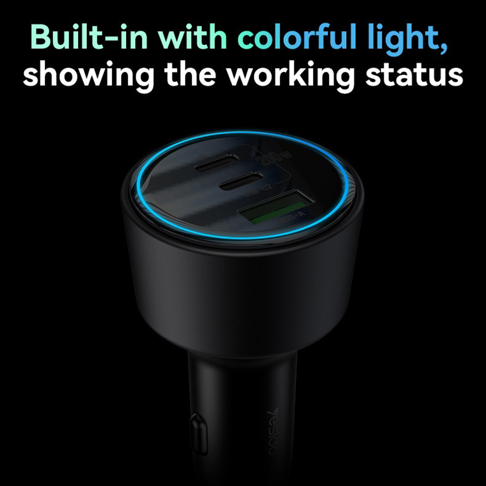 Yesido - Autós töltő (Y59) - 2x Type-C, USB-A, 200W, Gyors töltés, Többféle védelem, Beépített színes világítás - Fekete