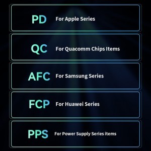 • Univerzális gyorstöltési protokollok támogatása: A töltő széles körű kompatibilitással rendelkezik, támogatva a legnépszerűbb gyorstöltési szabványokat, mint például a Power Delivery (PD) az Apple eszközökhöz, a Quick Charge (QC) a Qualcomm chipes készülékekhez, az Adaptive Fast Charging (AFC) a Samsunghoz, a Fast Charge Protocol (FCP) a Huawei-hez, és a Programmable Power Supply (PPS). Ez garantálja, hogy eszközei mindig a lehető leggyorsabban töltődjenek.