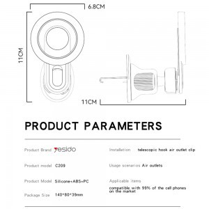 A teleszkópos kampós légbeömlő klipnek köszönhetően a Yesido C209 pillanatok alatt telepíthető a legtöbb autó légbeömlő rácsára. Univerzális kialakításának hála a 4,7 és 7,2 hüvelyk közötti eszközökkel, beleértve a MagSafe kompatibilis iPhone modelleket (például az iPhone 12, 13, 14 szériák), és a piacon lévő telefonok 99%-ával kompatibilis. Ezen felül nem takarja el a kilátást vezetés közben.