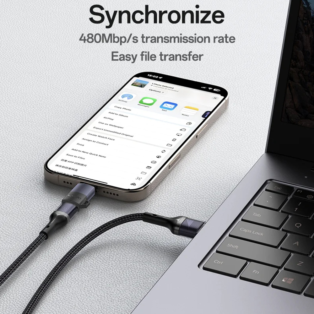 A 480Mbps sebességű adatátvitellel könnyedén szinkronizálhatod fájljaidat, képeidet és videóidat. Az "Easy file transfer" funkcióval a fájlok másolása és mozgatása egyszerűbb, mint valaha, legyen szó telefon és számítógép közötti adatcseréről vagy más Lightning eszközök csatlakoztatásáról Type-C porton keresztül.