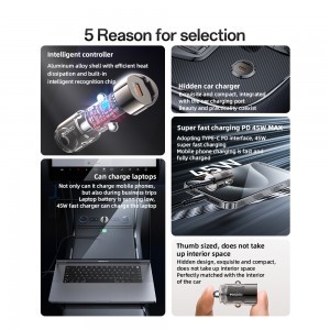 Keresel egy autós töltőt, amely nem csak gyors, hanem diszkrét és prémium minőségű is? A Yesido Y67 rejtett autós töltő a tökéletes választás! Kompakt méretének, elegáns kialakításának és kiemelkedő teljesítményének köszönhetően ez a töltő zökkenőmentesen illeszkedik autód belső terébe, miközben maximális sebességgel látja el energiával eszközeidet, akár még a laptopodat is.
