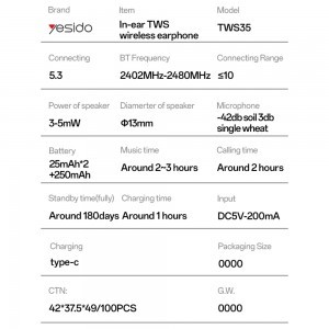 A Yesido TWS35 fülhallgatókkal nem kell aggódnia az üzemidő miatt. A fülhallgatókba épített 25mAh akkumulátorok egy feltöltéssel körülbelül 2-3 óra zenehallgatást vagy körülbelül 2 óra beszélgetési időt biztosítanak. A stílusos, 250mAh kapacitású töltőtokkal pedig akár 15 órára is meghosszabbíthatja a teljes zenehallgatási időt. A tok Type-C porton keresztül tölthető, és mindössze körülbelül 1 óra alatt teljesen feltölthető. Készenléti ideje pedig akár 15 nap is lehet, így mindig készen áll a használatra.