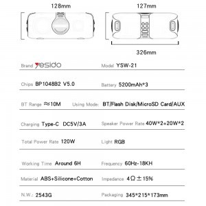 Ne hagyd, hogy az akkumulátor korlátozza a szórakozást! A Yesido YSW21 egy nagyméretű, 15600mAh (3x 5200mAh) kapacitású akkumulátorrendszerrel rendelkezik, amely akár 6 óra folyamatos zenelejátszást biztosít egyetlen feltöltéssel. A Bluetooth 5.0 technológia (BP1048B2 V5.0 chip) stabil és gyors vezeték nélküli kapcsolatot biztosít akár 10 méteres hatótávolságon belül. Emellett a hangszóró többféle bemeneti lehetőséget kínál, támogatja a Flash Disk (USB pendrive), MicroSD kártya (TF) és klasszikus AUX kábel csatlakoztatását is, így minden zenei forrással kompatibilis. Az intuitív kezelőfelületnek és a modern Type-C töltési portnak (DC5V/3A) köszönhetően a használat rendkívül egyszerű és kényelmes.