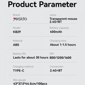 Ismerje meg a Yesido KB29 vezeték nélküli egeret, amely a modern technológiát és a letisztult dizájnt ötvözi a maximális kényelemért és hatékonyságért. Ez az áttetsző, "kristály egér" innovatív megjelenésével nem csupán egy eszköz, hanem stílusos kiegészítője is lehet asztalának. A fekete szín elegáns megjelenést kölcsönöz neki, miközben bepillantást enged belső, precízen elrendezett alkatrészeibe.